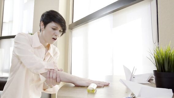 Возбужденный мастурбацией брат находит худенькую сводную сестру, приклеенную к столу и, пользуясь этим, вставляет в неё член, а после оргазма ведет её в комнату для оральных ласк и продолжения секса.