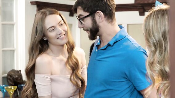 Праздничная суета, развлечения и две шатенки без трусиков под юбками напоролись на большой член сводного брата одной из девушек, занявшись жмж сексом, пока родители отошли в соседнюю комнату.