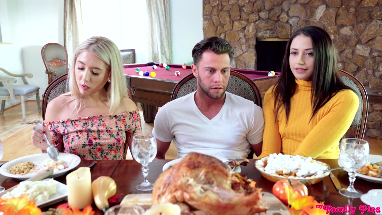 Две крайне озабоченные сестры начали приставать к парню ещё за ужином, а когда родители ушли, они присосались губами к члену, после чего возбужденный самец выебал блондинку и брюнетку прямо на столе.